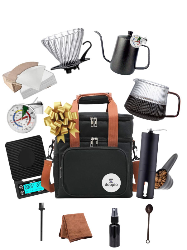 استمتع بتحضير قهوة مقطرة احترافية في أي مكان مع طقم DOPPIO V60 المكون من 12 قطعة. يضم جميع الأدوات الأساسية مثل غلاية برقبة إوزة، مطحنة يدوية، ميزان رقمي، دريبير وفلاتر، مع حقيبة حمل متينة لتنظيم وسهولة النقل. مثالي للاستخدام في المنزل أو المكتب أو أثناء التخييم والرحلات لعشاق القهوة الباحثين عن الجودة والدقة.