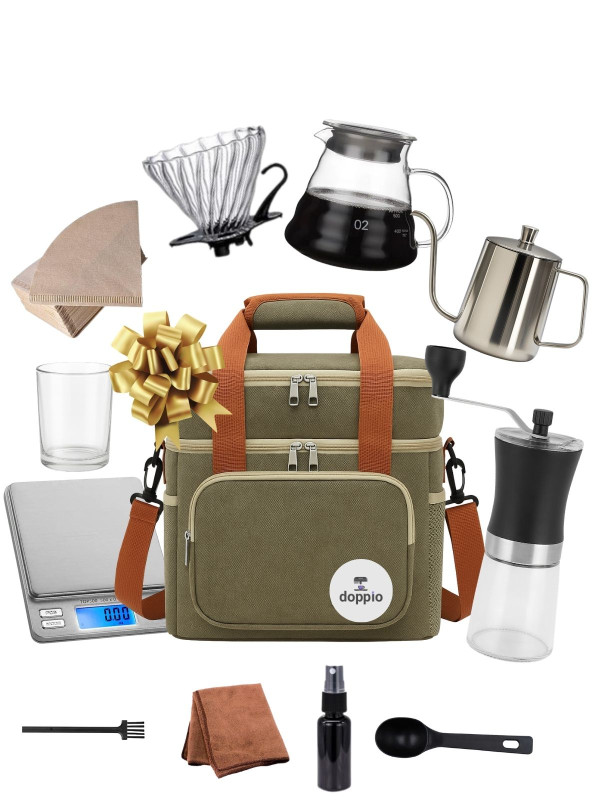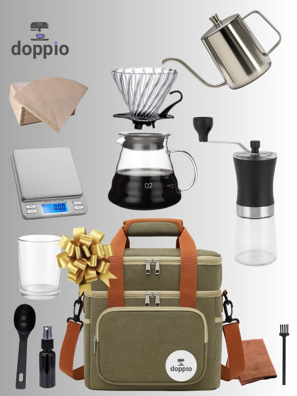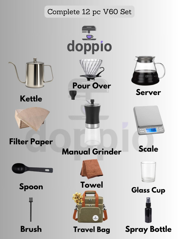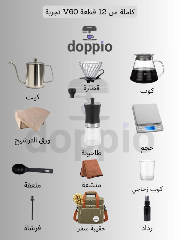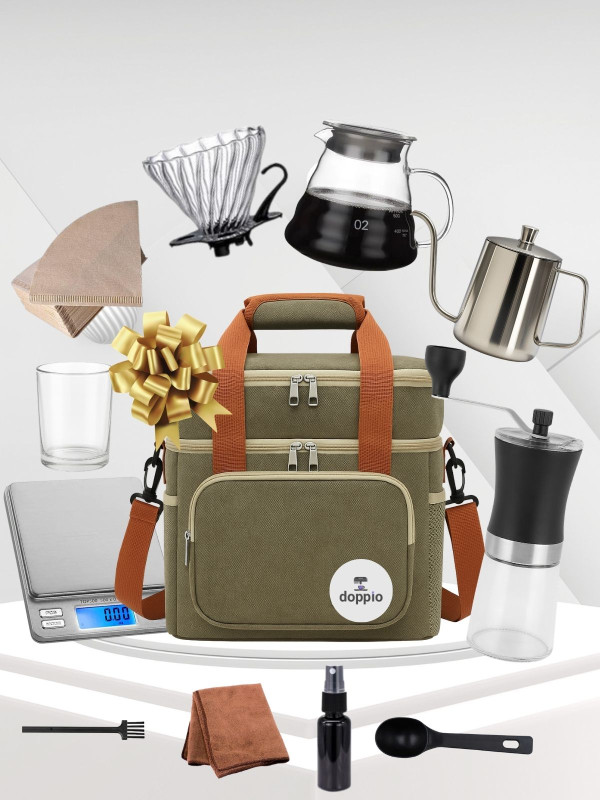 استمتع بتحضير قهوة مقطرة بجودة احترافية في أي مكان مع طقم DOPPIO V60 المكون من 12 قطعة. يضم غلاية ستانلس ستيل، مطحنة يدوية، ميزان رقمي، دريبير V60، إبريق زجاجي وفلاتر، مع حقيبة سفر عملية. مثالي للاستخدام في المنزل أو المكتب أو أثناء السفر، ويمنحك تحكمًا دقيقًا ونكهة قهوة غنية في كل مرة.
