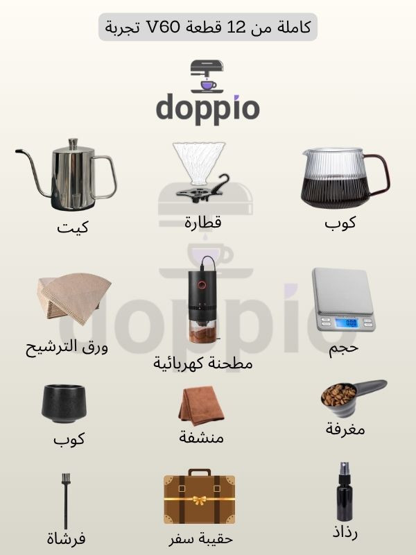 استمتع بتحضير قهوة مقطرة بجودة احترافية مع طقم DOPPIO V60 المكون من 12 قطعة. يضم مطحنة كهربائية، غلاية برقبة إوزة، ميزان رقمي، دريبير زجاجي، إبريق وفلاتر، مع حقيبة حمل عملية لتنظيم وسهولة النقل. يوفر دقة في الطحن والاستخلاص للحصول على نكهة غنية ومتوازنة، مثالي للمنزل أو المكتب أو السفر.