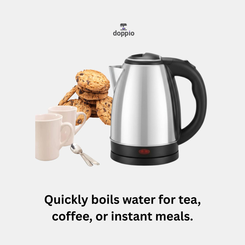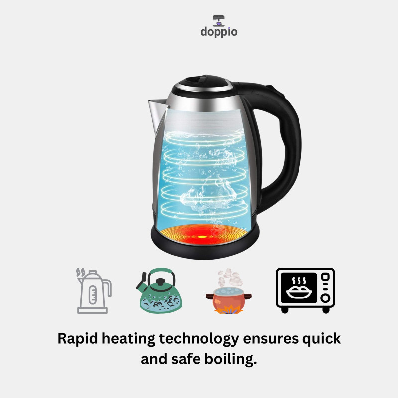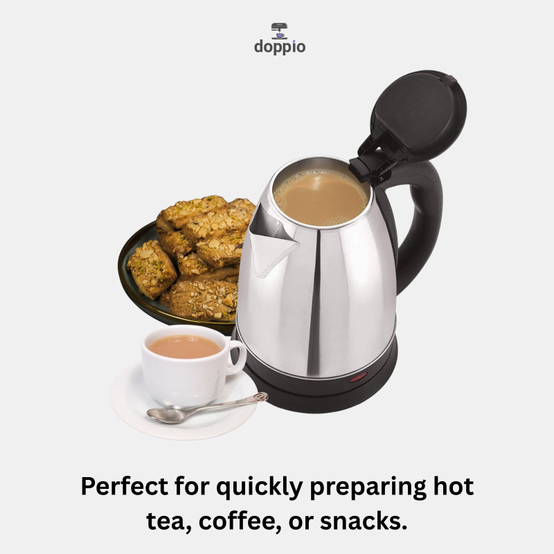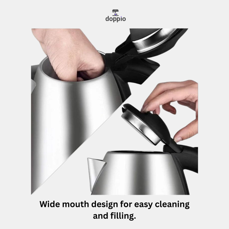 قم بغلي الماء بسرعة وأمان مع غلاية DOPPIO الكهربائية بسعة 2 لتر، المصنوعة من الستانلس ستيل المتين لتدوم طويلاً. مثالية لتحضير الشاي والقهوة والمشروبات الساخنة، وتتميز بخاصية الإيقاف التلقائي ومقبض مقاوم للحرارة لسهولة الاستخدام. تصميم أنيق باللونين الفضي والأسود يناسب المنزل أو المكتب.