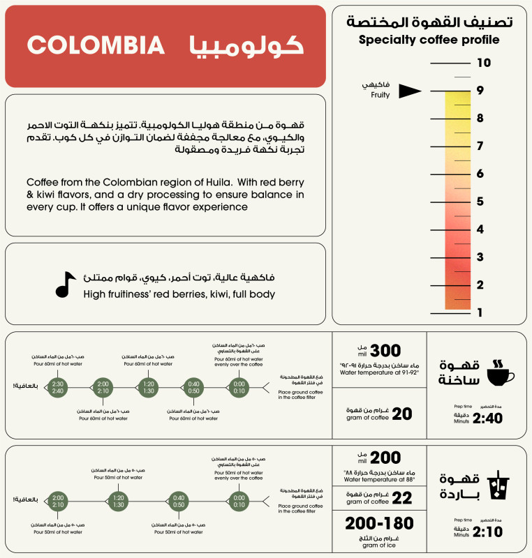 يبدأ المشوار من اختيار الحبوب بعناية، ثم تترك لتجف بتوازن يسمح بإبراز طبقاتها العطرية. خلال هذه العملية التقليدية، تتشكل حبوب القهوة الفريدة التي تجمع بين النكهات الفاكهية العالية والتعقيد الطبيعي.يأتي الفنجان النهائي ممتلئ القوام، غني بإيحاءات التوت الأحمر ولمسة من الكيوي، مع انسجام رائع يجعل التجربة متوازنة وغنية بالحياة.