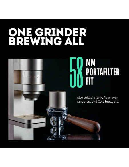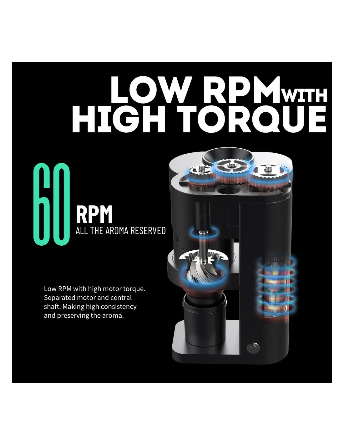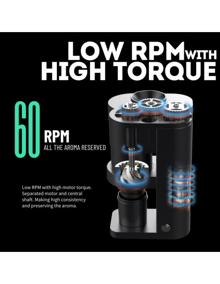 - محرك منخفض السرعة 60 دورة/دقيقة: تشغيل هادئ للغاية يقلل توليد الحرارة، مع الحفاظ على نكهات القهوة وتوفير جودة طحن متسقة.