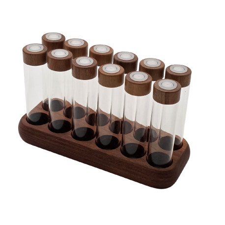 - Complete set: Includes 12 transparent glass tubes with wooden lids and an organized wooden base.