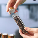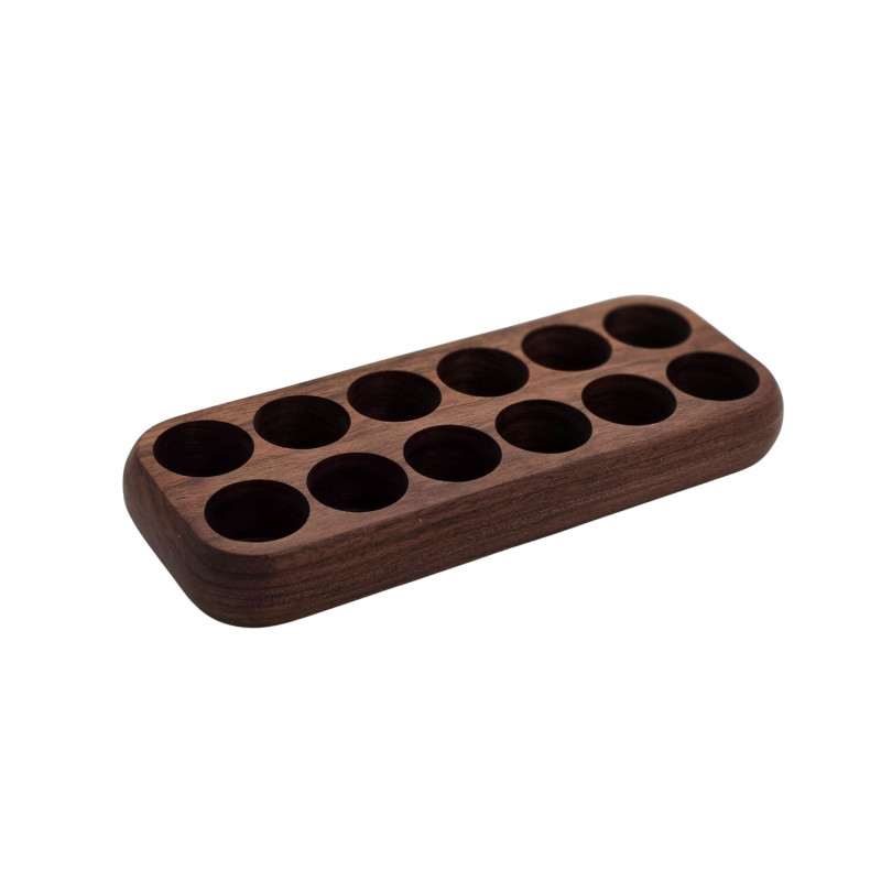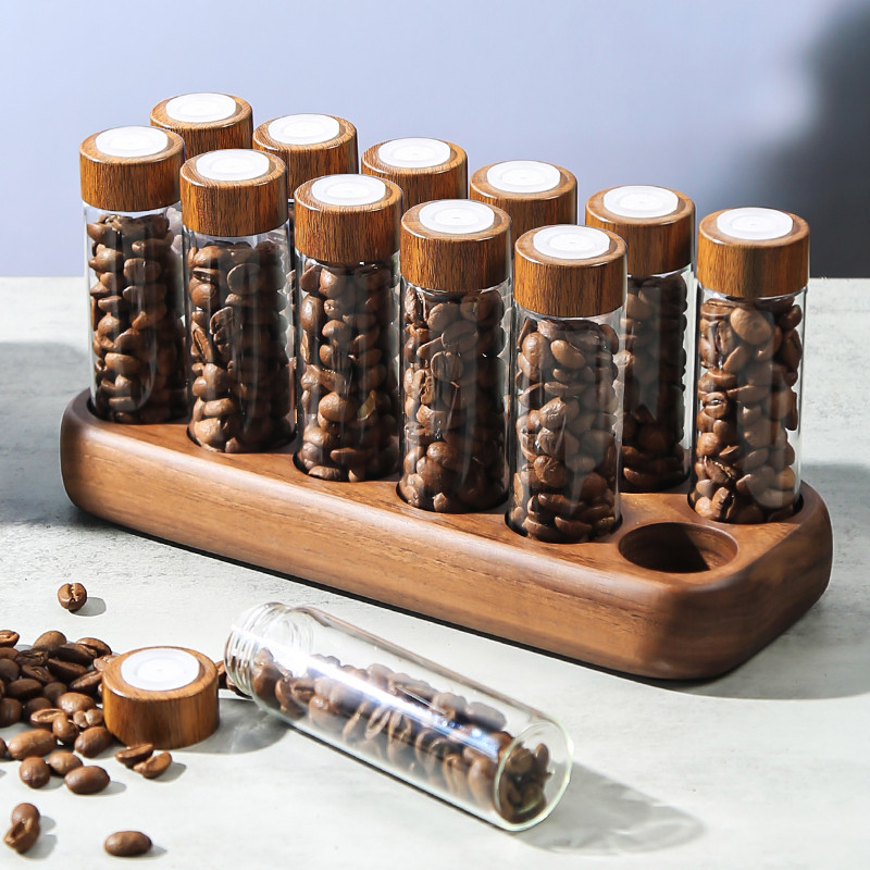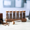 An elegant glass tube set consisting of 12 tubes with wooden lids and a practical wooden base. It makes dividing and storing coffee beans easy and stylish. The transparent glass tubes showcase the coffee beans clearly, while the wooden lids add a warm natural touch, and the wooden base keeps the tubes organized in an elegant way.