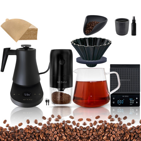 Digital Scale for Specialty Coffee Mibro Smart Electric Drip Kettle 800ml V60 Coffee Drip Funnel V02 Corrugated Suitable for 1-4 Cups V60 02 Paper Filters Brown Electric Coffee Grinder with Type C Charging 1800mAh Battery 130ml Glass Cortado Coffee Cup Black Cleaning Kit 650ml Glass Server Pitcher Black Ceramic Coffee Bean Weighing Plate Single Dose Coffee Bean Bottle