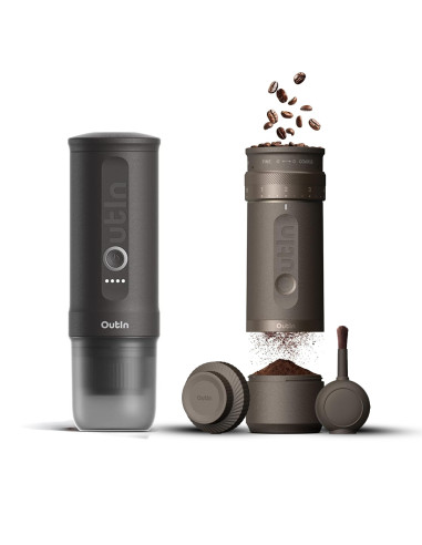 Outin Nano Portable Espresso Maker Space Grey & Fino Grinder Brown Pack
