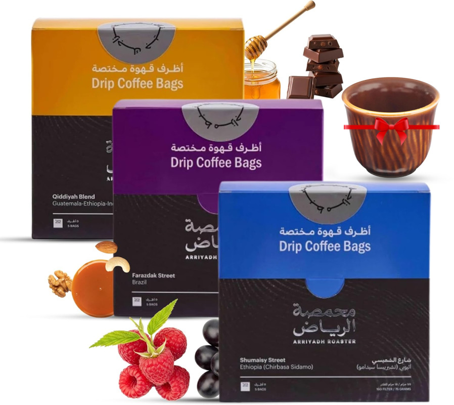 Discover the world of specialty drip coffee with the Coffee Drip Box Gift Set, curated by Riyadh Roastery for coffee lovers who want premium taste and convenience. This unique set includes three different specialty coffee packs, each offering distinct flavors, plus a stylish ceramic black cup to complete the experience.