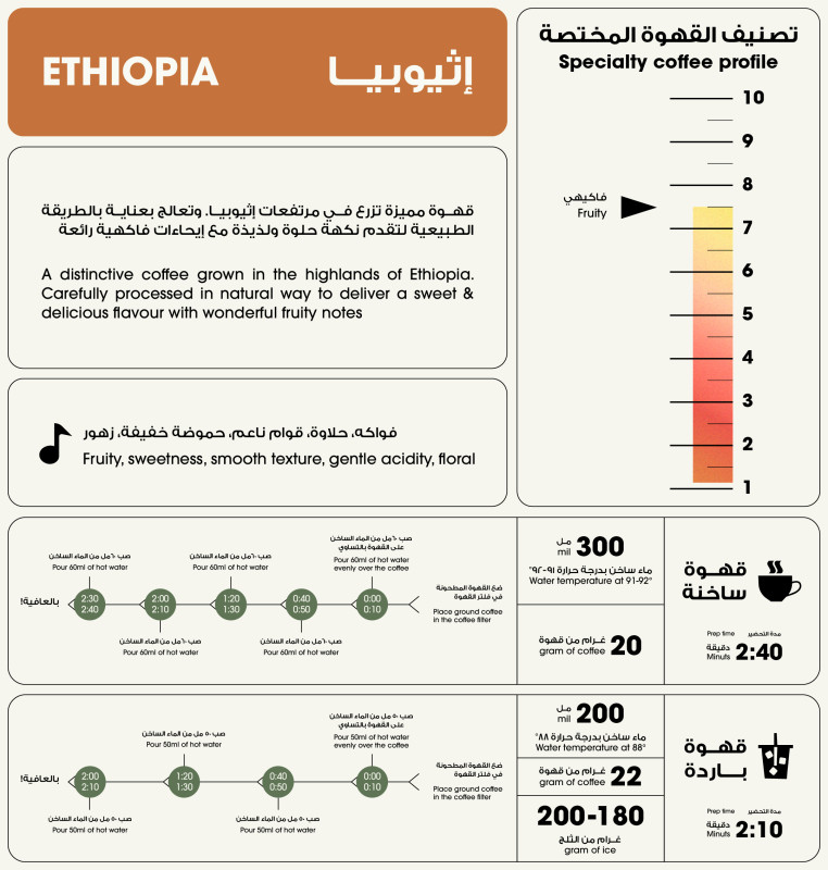The Ethiopia Sidamo Natural is a true delight for espresso lovers. Grown in the lush highlands of Ethiopia at an altitude of 1950 - 2150 masl, these beans are carefully processed using the natural method, resulting in a sweet and full-bodied cup with notes of green apple, sweetness, and brown sugars. The beans are of the heirloom variety, known for their complex and nuanced flavor profile.
