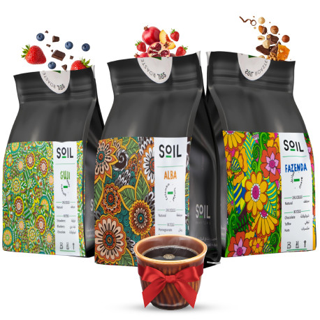 Enjoy premium specialty coffee with the SOIL Roastery Coffee Bean Set – Fazenda, Guji & Alba with Ceramic Cup. This carefully curated set combines three unique coffee origins, each delivering distinct tasting profiles from chocolate and nuts to strawberry, blackberry, parchment, and peas. Perfect for espresso, V60 pour-over, and French press, this set brings a balance of rich, fruity, and nutty flavors to your cup. It also makes a thoughtful gift for coffee enthusiasts.