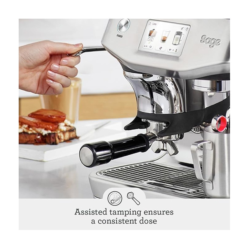 • Impress Puck System: This feature guides you through the dosing and tamping process. The machine uses intelligent dosing to grind the correct amount of coffee and an assisted tamping lever to apply a consistent 10kg (or 22 lb.) of pressure with a 7º barista-style twist. The system even auto-corrects the dose after each use for consistency.