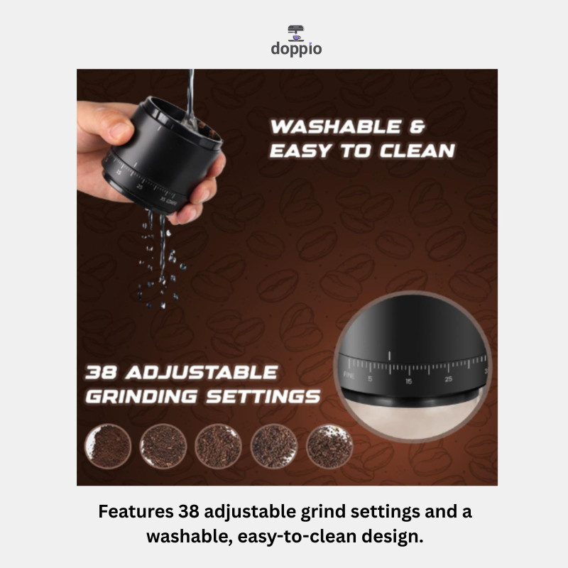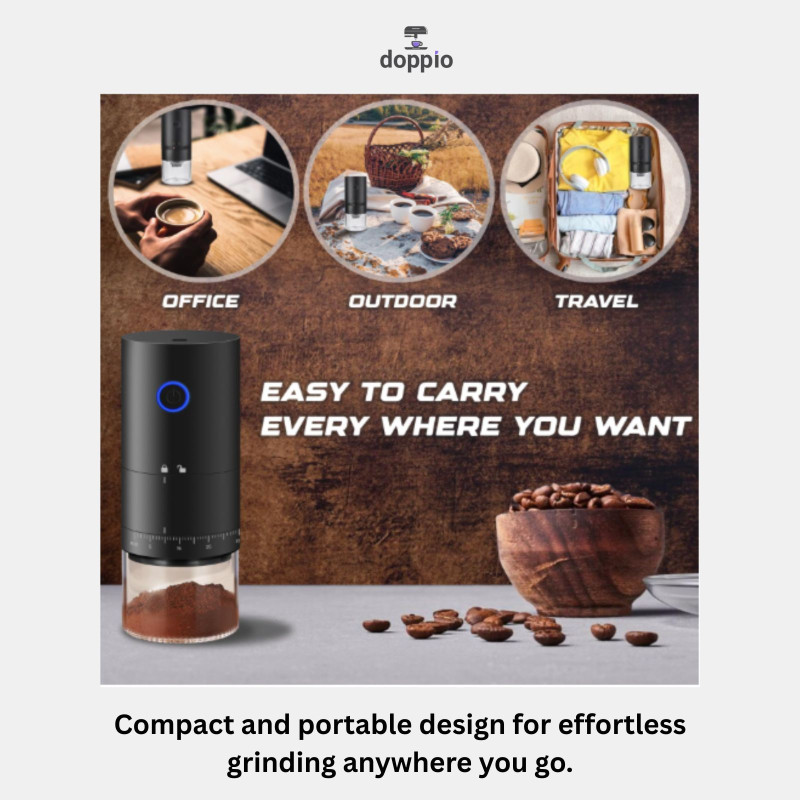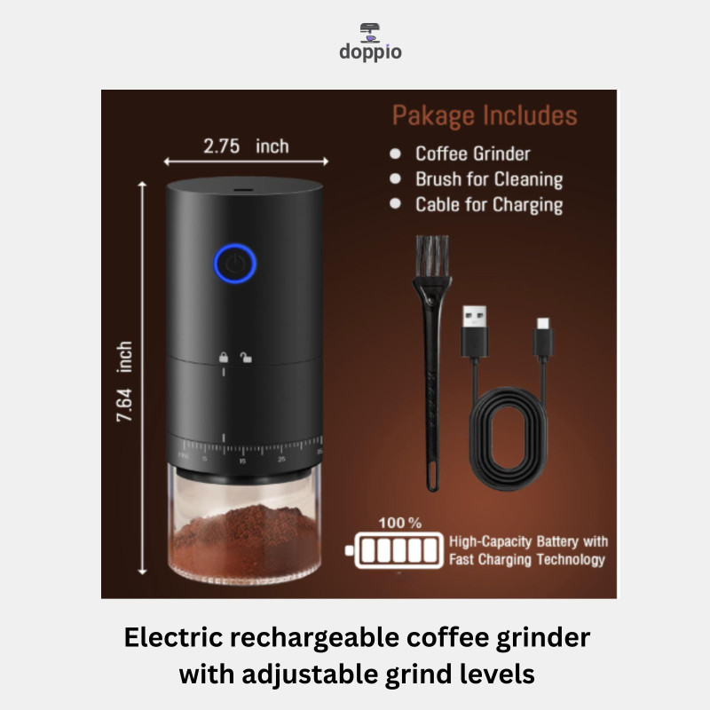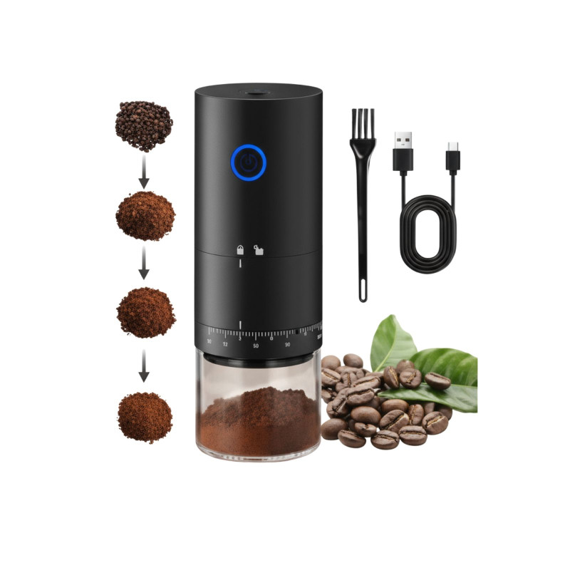Grind fresh coffee anywhere with this portable electric burr coffee grinder, featuring adjustable coarse and fine settings for precise brewing. Designed with a compact, lightweight build and USB rechargeable battery, it’s perfect for home, travel, office, or café use. With a removable chamber and durable design, it ensures consistent grinding and rich flavor in every cup.