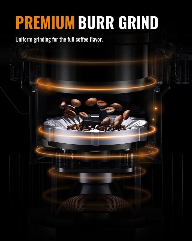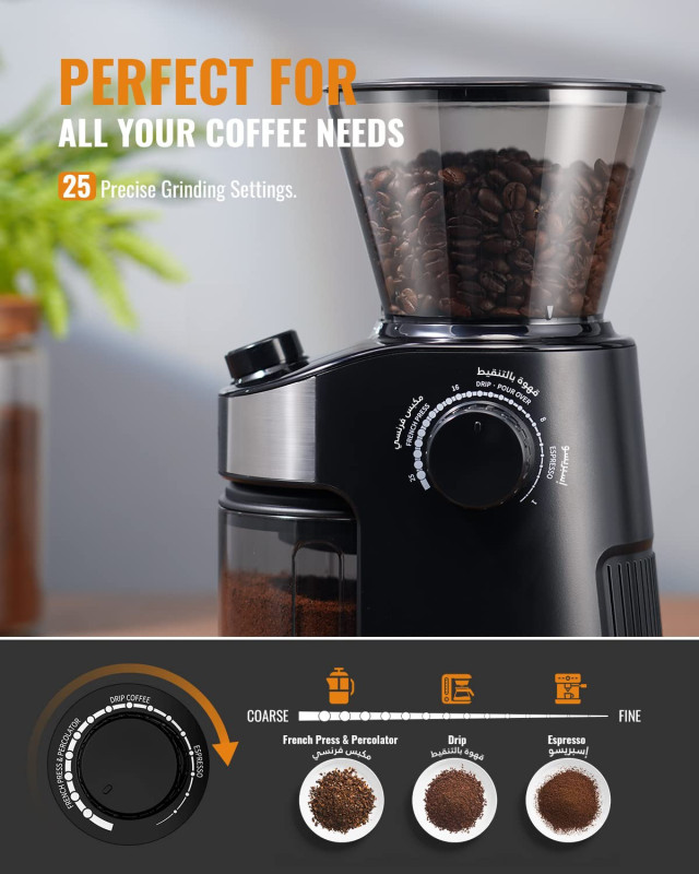 ✅ Electric Coffee Grinder – Stainless steel burr, 200W power, 25 grind settings, and 40-second digital timer, suitable for Espresso & V60