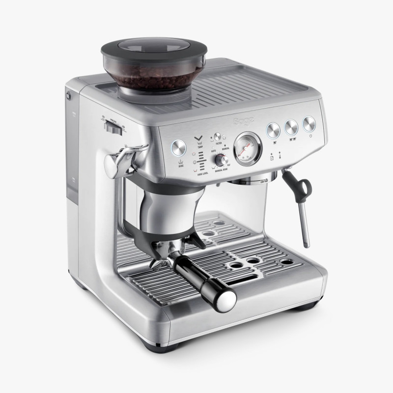 The Barista Express Impress by Sage is an advanced home espresso machine equipped with the Impress Puck System, which integrates grinding, dosing, and tamping into one streamlined process to ensure consistent extraction and minimal waste. It features a built-in conical burr grinder with 25 grind settings and an intelligent dosing system that automatically measures and adjusts the coffee dose based on previous extraction outcomes.